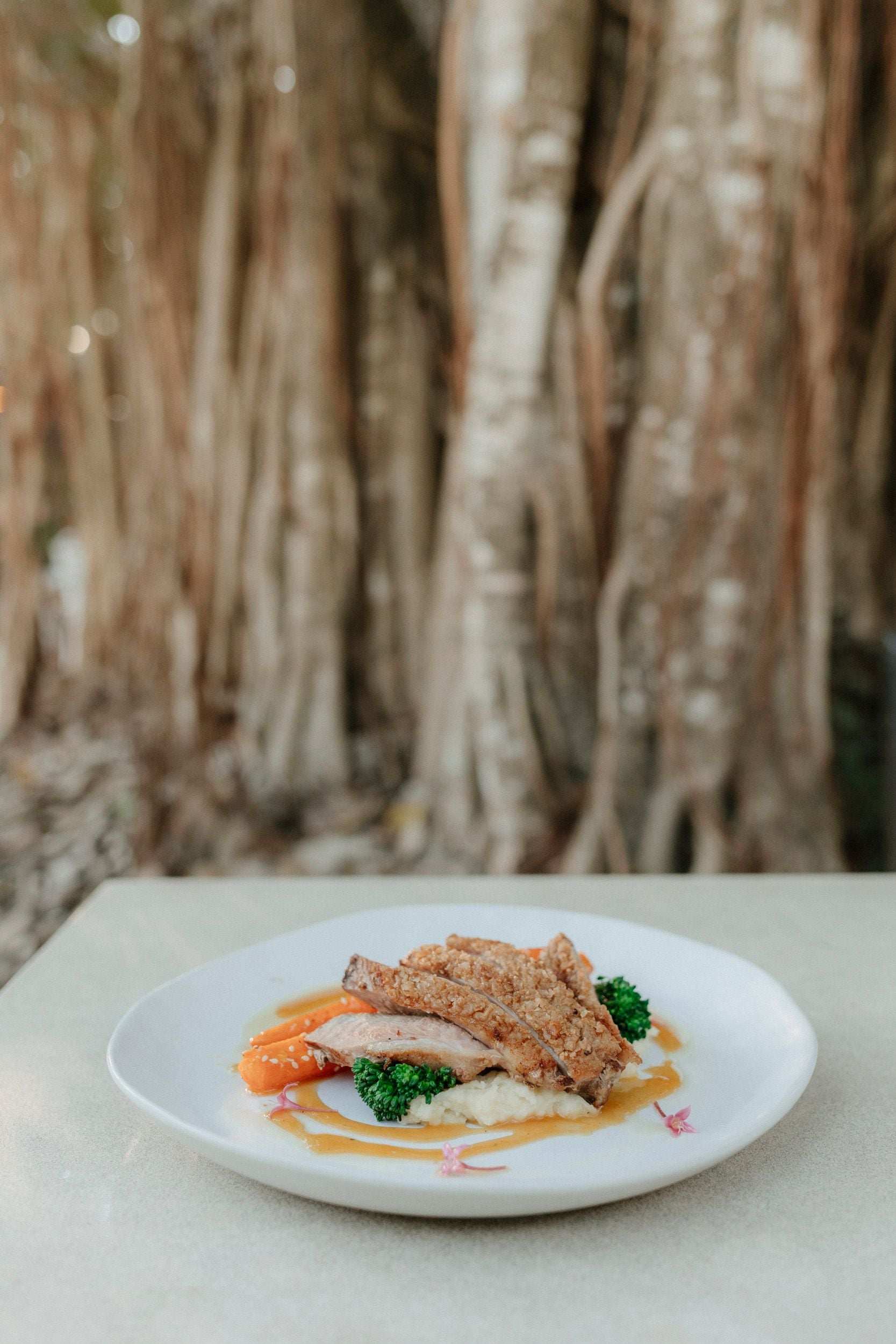 Dining at the Estate is all about setting and atmosphere. Relax on the veranda overlooking the sparkling waters of Crystal Creek, stay cozy by the fire in the cooler months, enjoy the shade of the grand Banyan tree, or find a quiet spot among the gardens. We’re also a dog-friendly café — furry friends on leash are more than welcome.